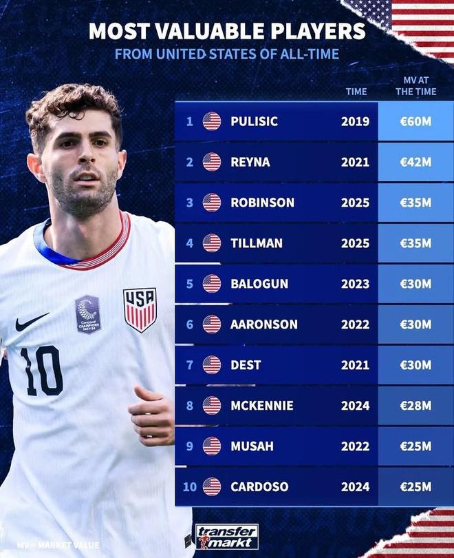 德转列美国球员历史身价前10:普利希奇6000万欧元第1